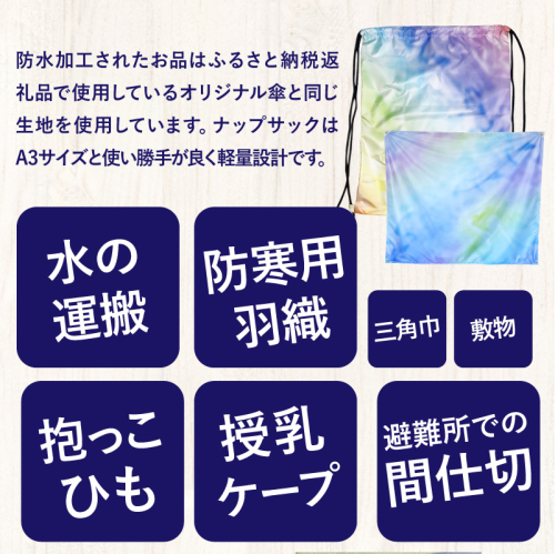 防水加工された生地のナップサックや風呂敷は市場に少なく無地で地味な物ばかりです。ドリフのオリジナルデザインで、普段使いにも最適です。