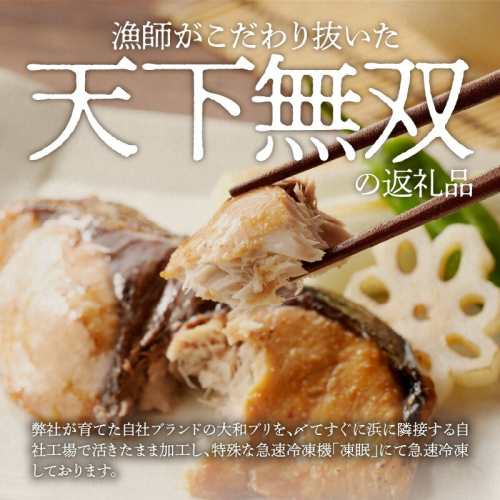 漁師がこだわり抜いた天下無双の返礼品です! 弊社が育てた自社ブランドの大和ブリを、〆てすぐに浜に隣接する自社工場で活きたまま加工し、特殊な急速冷凍機「凍眠」にて急速冷凍しております。 流水で解凍すれば生きている食感になり、自然解凍すればふわふわに焼けます。 【地場産品基準】 3号:延岡市内において製造、加工その他の工程のうち主要な部分を行うことにより相応の付加価値が生じている返礼品(全行程のうち延岡市内にて行う主要工程の割合:100%)