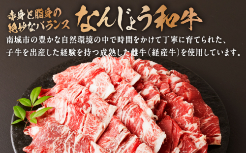 ハートのまち南城市のなんじょう和牛生産組合員が、まごころ込めて育てた「なんじょ う和牛」 南城市の豊かな土地の恵みを受けた牧草を食べ肥育した黒毛和種の経産牛(子牛を産ん だ経験のあるお母さん牛) 格付け等級2級以上で、脂身が少なく独特な風味と旨みがあります。 ※本品は、様々な部位(もも、うで、バラなど)を使用しており、切り落としの為、肉片の大きさにばらつきや赤身・ 脂身の割合に偏りがあります。