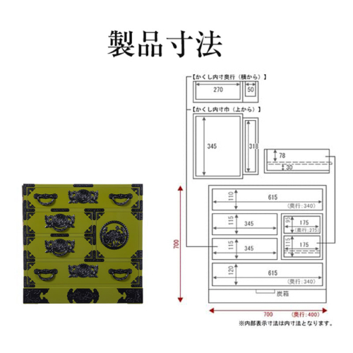 奥からもう一つ引出しが出てくる。引出しの中が二重になっている。秘密がいっぱいのワクワクするような仙台箪笥。すべて江戸時代からの、伝統の匠の技です。 シンプルなたたずまいの中に、様々な工夫を凝らした仕掛けが隠されています。 鮮やかな常盤色の漆塗りが魅力。コンパクトサイズなので玄関ホールやリビングのアクセント家具として人気です。 ■ 宮城県 利府町 ■ 欅産業 仙台箪笥 タンス たんす 高級 工芸品 伝統