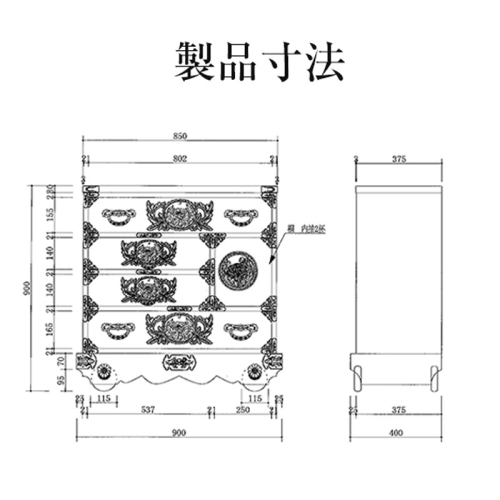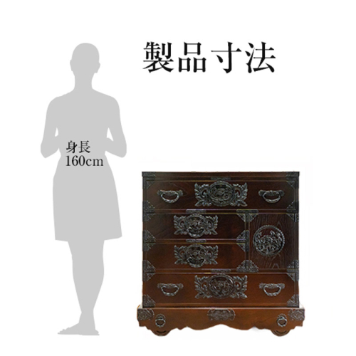 火事が多かった江戸時代は貴重品の入った箪笥に車をつけて、押して逃げたそうです。 伝統的なデザインは現代のインテリアにも華やかさと風格を添えてくれます。 堅木で作られた車輪の作りは職人のこだわりの部分。 巾と高さが90cmと圧迫感のないちょうどいいサイズ感です。 玄関や居間、床の間などに置いて頂くと、インパクトのある個性的な空間が演出できます。 杢目を活かす拭き漆塗りの仕様も味わい深い逸品です。 ■ 宮城県 利府町 ■ 欅産業 仙台箪笥 タンス たんす 高級 工芸品 伝統