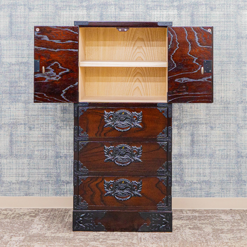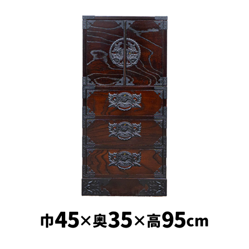 お部屋のサイズに家具を合わせても、お引越しや模様替えで生活空間が変わることもしばしば。 お客様のご要望の声から誕生した、巾45cmサイズのすきまチェストはほんの少しのデッドスペースを有効活用できる優れもの。 扉中央の丸い飾り金具が仙台箪笥らしい逸品。 花瓶や季節のお人形などを飾れば空間を華やかに演出できます。 ■ 宮城県 利府町 ■ 欅産業 仙台箪笥 タンス たんす 高級 工芸品 伝統