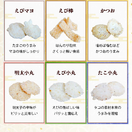 でん粉(国内製造)、えび棒生地(でん粉、えび、いか、砂糖、食塩、植物油脂)、いか、植物油脂、えび、たこせんのタレ(砂糖、みりん、発酵調味料、蛋白加水分解物、食塩、醤油、鰹エキス)、食塩、たこ、砂糖、鰹節エキス、唐辛子、梅シーズニング、辛子明太子、粉末マヨネーズ風調味料、いか焼きのたれ(醤油、砂糖、水飴、発酵調味料、果糖ぶどう糖液糖、デキストリン、みりん、鰹節エキス、昆布エキス、香辛料)、鰹節、乾燥梅肉、わさび茎、しらす、蛋白加水分解物/加工でん粉、調味料(アミノ酸等)、香辛料抽出物、膨張剤、着色料(クチナシ、ベニコウジ色素、パプリカ色素、アントシアニン色素、カロチン)、甘味料(ソルビトール、ステビア、カンゾウ、アセスルファムK)、酸味料、香料、酸化防止剤(V.C、V.E)、ナイアシン、増粘多糖類、発色剤(亜硝酸Na)、(一部に小麦・卵・乳成分・えび・かに・いか・大豆・ゼラチンを含む)