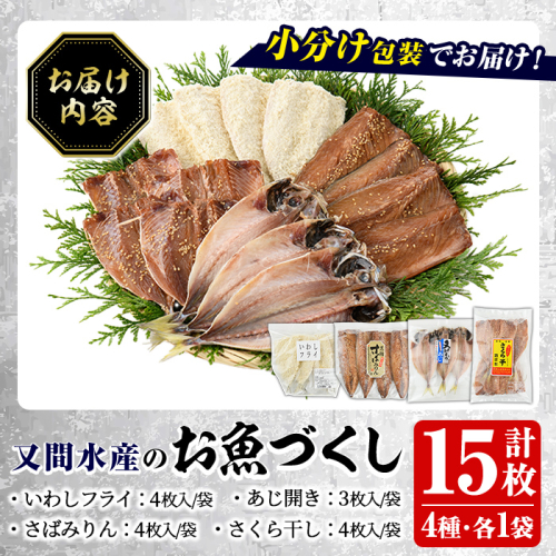 訳あり!又間水産のお魚づくし(4種・計15枚) 国産 ひもの 魚介 小分け 個包装 詰め合わせ 干物セット みりん干し アジ あじ 開き 鯵 サバ さば 鯖 鰯 いわし イワシ フライ おかず おつまみ【又間水産】akn001-09 2143764 - 鹿児島県阿久根市