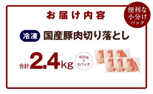 国産豚肉の切り落とし2.4kg(400g×6パック)をお届けいたします。