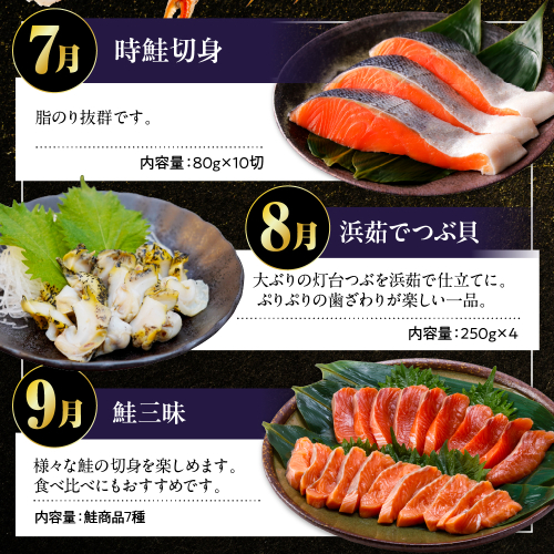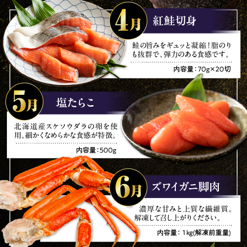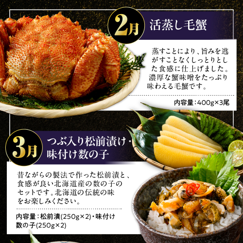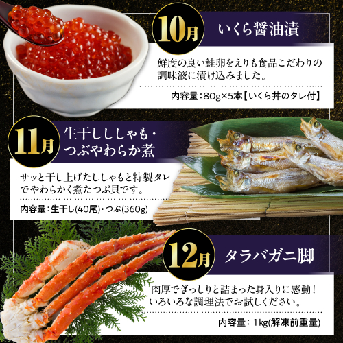 定期便 北海の味わい 毎月お届けコース年12回 【er001-041-d】海鮮 / たらちり鍋セット 毛がに 松前漬 数の子 紅鮭 たらこ ずわいがに ボイル済み 時鮭 灯台つぶ つぶ貝 鮭切身 いくら 醤油漬 ししゃも 刺身用 海鮮定期便 魚介 北海道 えりも町