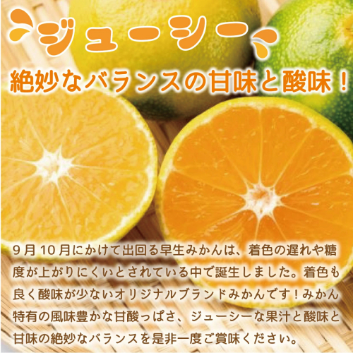 9月10月にかけて出回る早生みかんは、着色の遅れや糖度が上がりにくいとされている中で誕生しました。 着色も良く酸味が少ないオリジナルブランドみかんです!福岡県産で、9月10月の期間のみ味わえます!