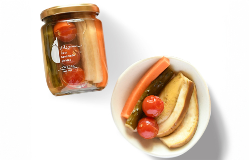 原材料名:水なす、大根、にんじん、きゅうり、トマト、ローリエ、鷹の爪 漬け原材料[米酢、昆布だし、鰹だし、しいたけだし、砂糖類(粗糖、グラニュー糖)、食塩、みりん、香辛料(ローリエ)]