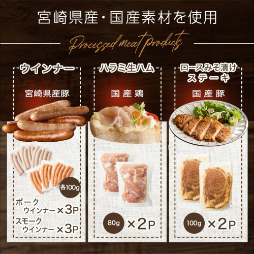 宮崎県産のポークウィンナー&スモークウィンナー、希少部位の鶏ハラミの生ハム、しっかりとした味つけのロースみそ漬を真空パックでお届け!
