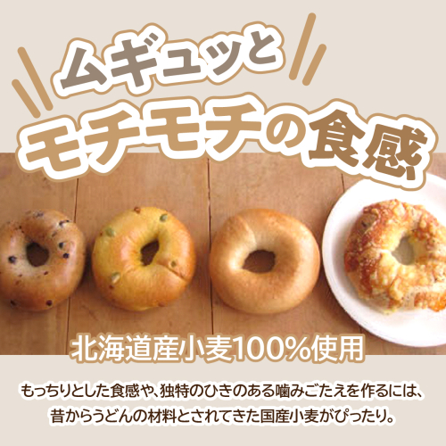 北海道産の小麦を100%使い、2種類の小麦粉をブレンドして焼き上げたベーグルです。