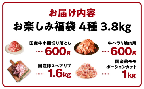 肉福袋 4種 3.8kg 焼肉セット(牛肉 切り落とし/牛ハラミ/豚肉 スペアリブ/鶏肉)【氷温熟成×極味付け 焼くだけ 食べ比べ ふくぶくろ お楽しみ 簡単調理】 mrz0222