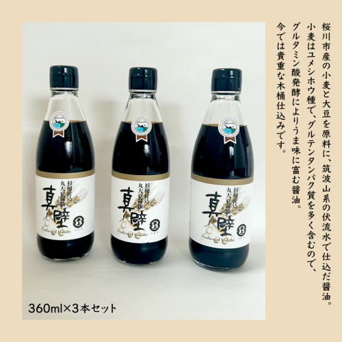 - 丸大豆醤油・真壁 ( 360ml × 3本 ) 醤油 しょうゆ しょう油 調味料 きあげ醤油 木桶仕込み 老舗 桜川市 鈴木醸造 手作り 田舎 セット 無添加 国産 老舗 丸大豆 おためし お試し ミニ [EP010sa]