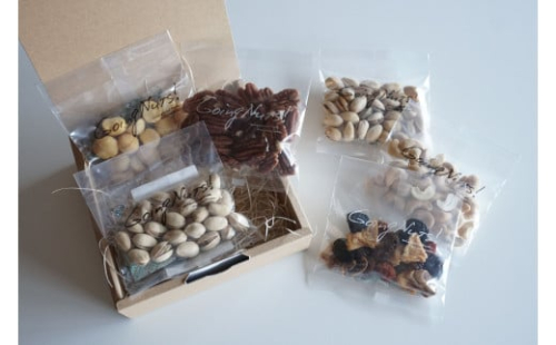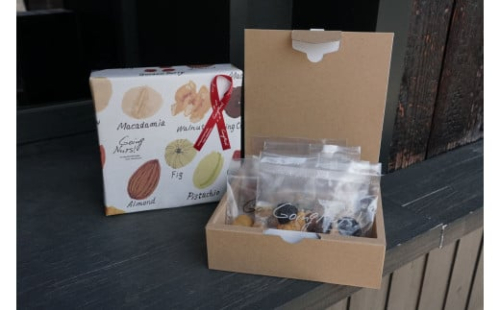 マカダミアナッツ(オーストラリア産)、ピーカンナッツ(アメリカ産)、カシューナッツ(インド産)、ピスタチオ(アメリカ産)、食塩、ハーブ類(タイム、オレガノ、ローズマリー)、オリーブオイル、パイナップル(コスタリカ産)、有機白イチジク(トルコ産)、ビングチェリー(アメリカ産)、有機ゴールデンベリー(ペルー産)、有機クランベリー(カナダ産)、有機リンゴ果汁、有機ヒマワリ油