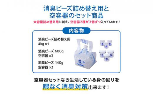 消臭ビーズ4kg、消臭ビーズ容器600g用×3個、消臭ビーズ容器140g用×3個