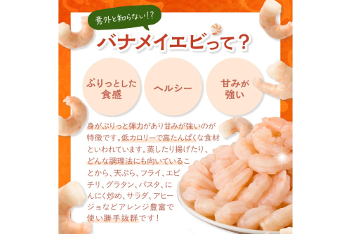 使いやすく大変便利な背ワタ除去済みの養殖バナメイのむき海老。 IQF凍結(バラバラ凍結)のため使いたい時に「使いたい量だけ解凍して使用」できて非常に便利。 食感も良く、口当たりがソフトで甘味もあるバナメイ。 蒸したり揚げたり、どんな調理法にも向いています。大きくてプリプリ食感ですので、天ぷら、フライ、エビチリ、グラタン、パスタ、にんにく炒め、サラダ、アヒージョにどうぞ。 ※画像はイメージです。 ※返送となった場合、再送はいたしません。 ※着日(曜日含)の指定はできません。予めご了承の上、お申し込みください。 保存方法: −18℃以下で保存して下さい。 地場産品類型番号|理由: 3|製造工程のうち、原材料の仕入れから殻剥き、背ワタ取り、味付け、冷凍、パッケージングまでの全ての工程を区域内の工場で行っており、本工程による付加価値が返礼品の付加価値のうち過半を占めているため。