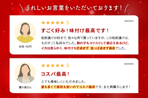 去年もいただき、今年もお願いしました去年よりすこし量は少なかったですが、小分けになっていて、それに数の子が去年よりずいぶんいっぱい入っててめちゃくちゃ嬉しかったし、美味しいですまた来年もお願いしようと思うので、よろしくお願いいたします