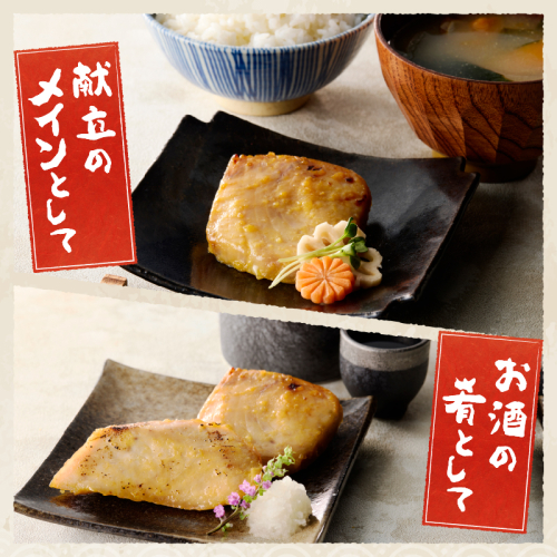 【説明】鮪はえ縄船が漁獲した鮮度の良いクロカジキを使用し、味噌本来の旨味・甘さ引き立つ自社配合の西京味噌に漬け込んだ製品です。創業100年になります。
