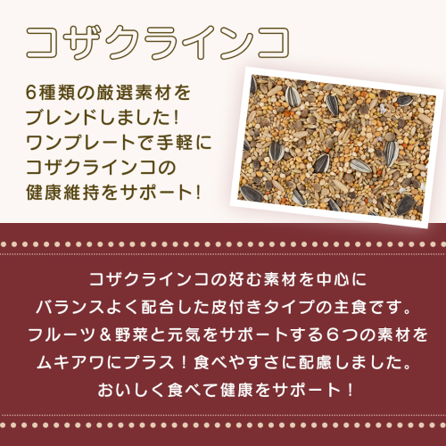 コザクラインコの好む素材を中心にバランスよく配合した皮付きタイプの主食です。