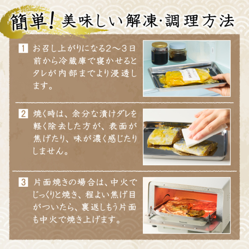 【説明】東シナ海で漁獲した鮮度・脂乗りの良いサワラを使用し、味噌本来の旨味・甘さ引き立つ自社配合の西京味噌に漬け込んだ製品です。創業100年になります。
