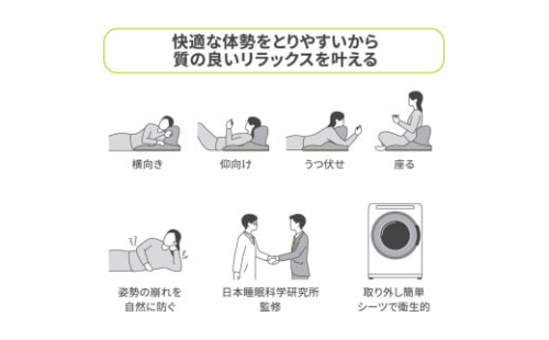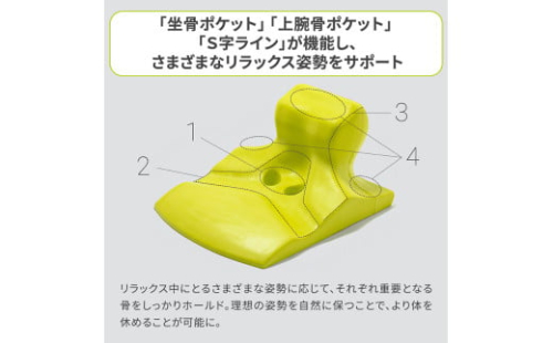 ■「坐骨ポケット」「上腕骨ポケット」「S字ライン」が機能し、さまざまなリラックス姿勢をサポートします。座り、横向き寝、仰向け寝、うつぶせでリラックスタイムをアップデート。