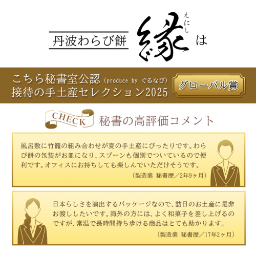 ・常温で30日持つのがとても良いです。風呂敷や竹籠は再利用できますし、わらび餅のパッケージもコンパクトに処理でき、SDGsの観点からも良いと感じました。(情報通信・IT 秘書歴20年0ヶ月)