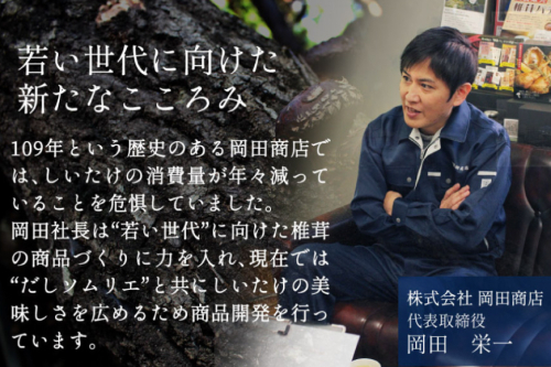 常に新しい乾椎茸の形を提案し続け、乾椎茸の食文化と生産を次世代に継承する…それが岡田商店の想いです。