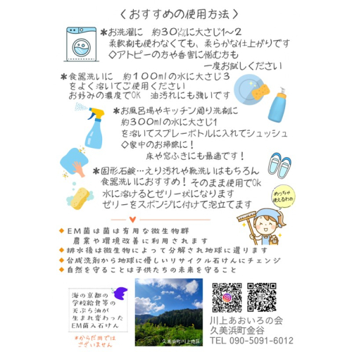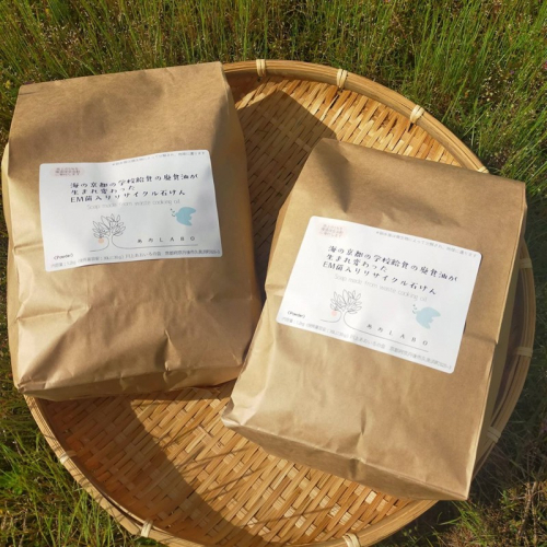 京丹後市の学校給食などの天ぷら油が生まれ変わったEM菌入りリサイクル石けん 洗濯にも、水で溶いてご家庭のお掃除にも EM菌の働きで匂いも気にならない 環境に優しい石けんです 事業者:川上あおいろの会 【地場産品類型】3 【類型該当理由】区域内の事業所において、製造の全工程を行うことにより、相応の付加価値が生じているもの