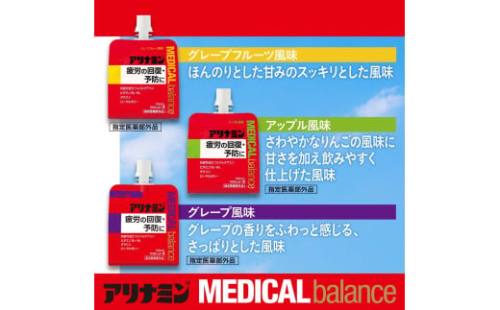 - 【3か月定期便】アリナミンメディカルバランス 4種セット(ソーダ味、グレープフルーツ味、アップル味、グレープ味) / ゼリー フルスルチアミン ビタミンB2 B6 タウリン ローヤルゼリー 防災 備蓄 トレーニング 登山 ロードレース 行動食 カロリー補給 エネルギー 集中力 維持 改善 疲労回復 予防 集中 キャンプ ドライブ 空腹 仕事 勉強 サウナ 風呂 奈良県 葛城市【tept-tkb013】