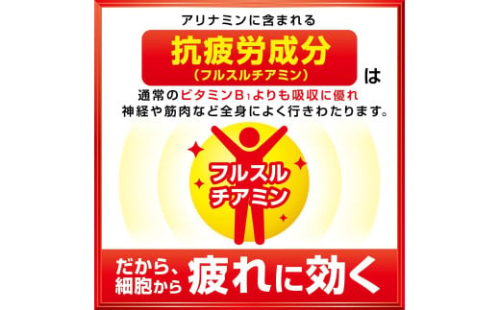 カラダや脳のエネルギー作りを助ける抗疲労成分フルスルチアミンに加え、ビタミンB2・B6、タウリン、ローヤルゼリーを配合。疲労の回復、集中力の維持・改善に効き、⾷欲不振時の栄養補給にもおすすめ。