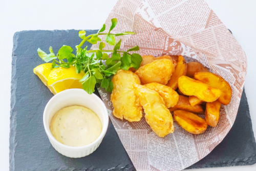 気仙沼港で水揚げされた新鮮なヨシキリザメを使った「ピーチシャーク フリッター」です。