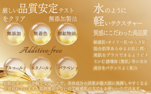水のように軽いテクスチャーで質感にこだわった高品質の美容液です。 市販品の500倍のビタミンC誘導体があらゆるお肌にアプローチ。 またアルコール・エタノール・パラベン・鉱物油は使用せず無添加、無着色にもこだわったことで、お肌へのダメージが軽くなり、美容成分の効果が最大限に発揮されやすくなるといわれています。 オーガニックの為、今までアレルギーやアトピーにより美容液が痛くて使用できなかった方にも大変ご好評いただいており、シミ・シワ・肝斑・たるみ・ニキビ・毛穴・お悩みの方や、ハリ・透明感が欲しい方、満足できる美容液にまだ出逢われたことのない方に、こだわりの美容液を自信をもってオススメさせていただきます。 主な原材料:アスコルビン酸(ビタミンC誘導体)