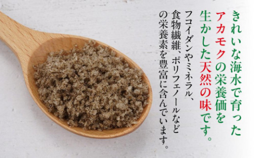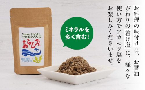 丹念に仕上げた平釜塩「あらしお」に用宗産のアカモクを含ませ、少量の真昆布も加えました。