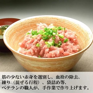 【説明】日本一、魚の水揚げが多い焼津で三本の指に入るマグロ問屋が、ネギトロを作りました。主原料に、延縄で取れた大鉢(40kg以上のメバチマグロ)をたっぷり使用、巻き網と違い、生きた状態で船上に水揚げされる延縄マグロ、メバチ7:キハダ3の割合で、混ぜ合わせました(一般的には、メバチ2:キハダ8)。赤色が鮮やかです。スジの少ない赤身を選別し、血栓の除去、練り(混ぜる行程)、袋詰め等、ベテランの職人が、手作業で作り上げます。お酒のつまみや炊きたてのご飯、または酢飯にのせてネギトロ丼がオススメ。衛生面で国際的に認められた、HACCP認定工場で作っているので、安心です。解凍方法は、簡単。袋のまま、水が入ったボウルに入れ、水道の流水で、10~15分。150gをネギトロ丼にすると、約2~3杯分。時間の無い時、パパッと簡単にご飯の準備が出来ますよ。お父さんには、晩酌のおつまみ、育ち盛りのお子さんには、炊きたての白いご飯にのせ、ネギトロ丼。家族みんなの時は、手巻き寿司が、オススメです。焼津 さかなセンターの店頭(店舗名:マルショウ)や、インターネットのホームページ(店舗名:焼津屋)でも、喜ばれている ネギトロ です。早期発送、すぐ届く。混雑時以外、3週間以内に返礼品をお届けします。それより早くお届けできることもあります。また12月後半の寄附の場合、到着に1ヶ月ほど頂いております。
