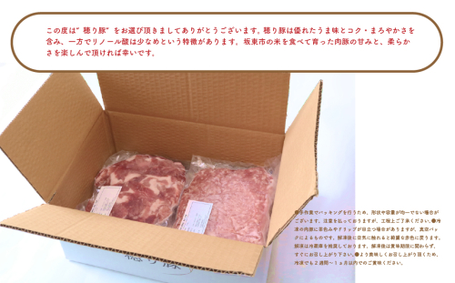 国産穂り豚100%原料でこま肉は小さめにカットされ料理に使いやすく、挽肉は余分な脂肪も落としています。 どちらも赤みが強く、しっかりとした旨味が味わえます。 穂り豚は優れたうま味(うま味アミノ酸)とコク・まろやかさ(ペプチド構成アミノ酸)を含み、一方リノール酸は少なめで雑味の少ないお肉です。 坂東市の米を食べて育った肉豚の甘みと、柔らかさを楽しんで頂ければ幸いです。 本返礼品の主要な部分は、坂東市にて生産、製造または加工したものが占めております。