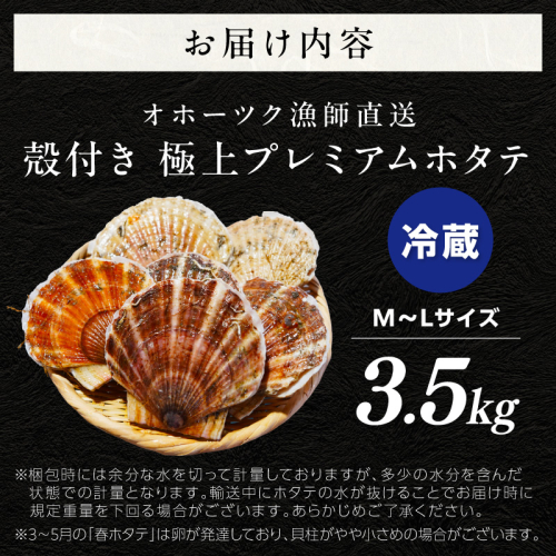 【予約:2026年3月下旬から順次発送】北海道オホーツク産 漁師直送 殻付きプレミアムホタテ 3.5kg ( 魚介 海鮮 貝 ホタテ ほたて 帆立 生食 炙り焼き バター焼き )【197-0001-2026】