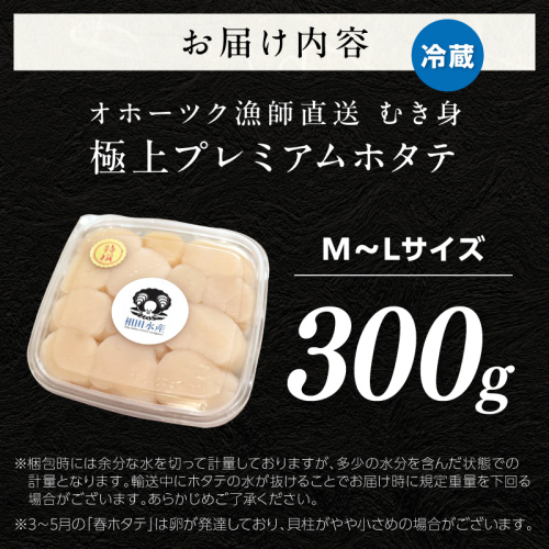 【予約:2026年3月下旬から順次発送】北海道オホーツク産 漁師直送 むき身プレミアムホタテ 300g ( ホタテ ほたて 帆立 魚介 海鮮 貝 生食 バター焼き )【197-0002-2026】
