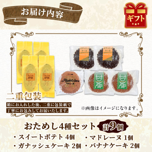 - 【0063810a】小さなお菓子屋さんのおためしセット(4種・計9個) スイートポテト さつまいも サツマイモ マドレーヌ ガナッシュケーキ バナナケーキ お菓子 菓子 スイーツ おやつ 【吉川菓子店】