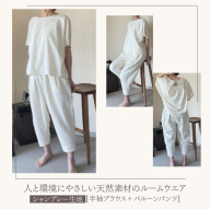 選べるトップスとボトムスのルームウエアのセット / 受注生産での商品提供を行います。 最短納期は10日~1ヶ月で、月5名様の限定です。 人と環境に優しい服をコンセプトに、身に着ける人への影響はもちろん、綿花の栽培における社会問題に対しても労働者と環境に配慮された=エシカル消費に繋がるモノづくりをしなければならないという思いからオーガニックコットンにこだわって素材選びを行い制作しています。 地場産品基準に該当する理由 告示第5条第3号に該当 当該地方団体の区域内において返礼品等の製造、加工その他の工程のうち主要な部分を行うことにより相応の付加価値が生じているものであること。