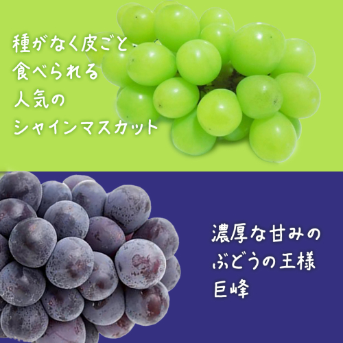 ぶどうの王様「巨峰」の濃厚な甘みと、種がなく皮ごと食べられる人気の「シャインマスカット」の上品な甘みが一度に楽しめる、まさに夢のような組み合わせです。