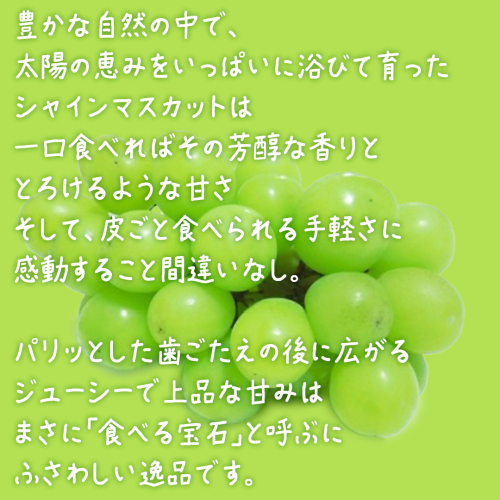 旬の輝き、シャインマスカット!芳醇な香りと、とろける甘さ。皮ごと味わう「食べる宝石」をお届け。