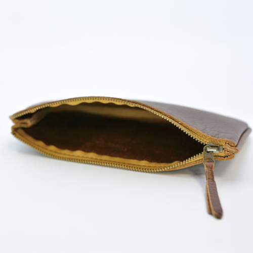 手馴染みのよいソフトな牛革を使用した、お札が入るサイズのポーチです。 お財布とは別に分けておきたいお金を入れたり、用途いろいろ、マルチケースとしてもご使用ください。 マチがなく薄型なので、持ち運びにも便利です。 牛革では使い込むほどに艶と色に深みが出ます。 益子町のアトリエにて、ひとつひとつ心を込めて手作りしたものをお届けします。 【注意事項】 ※手づくりのため、サイズ・色に多少の誤差があります。 ※水濡れはシミの原因となりますので、ご注意ください。 ※革には、もともと脂分が含まれていますが、2か月に1回くらい革用オイルを拭き込むと長持ちします。
