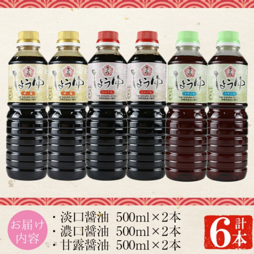 - No.1163 さくらしょうゆ3種(淡口醤油・濃口醤油・甘露醤油 500ml×各2本 計6本)【伊集院食品工業所】