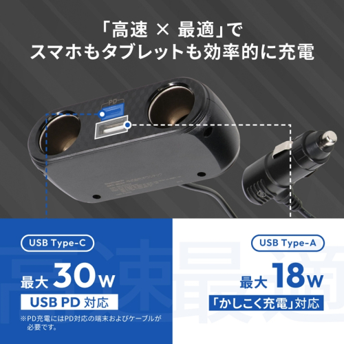 USB Type-Cポートを1基、USB Type-Aポートを1基、アクセサリーソケットを2基増設でき、スマートフォンの充電からドライブレコーダーへの給電などにお使いいただけます。