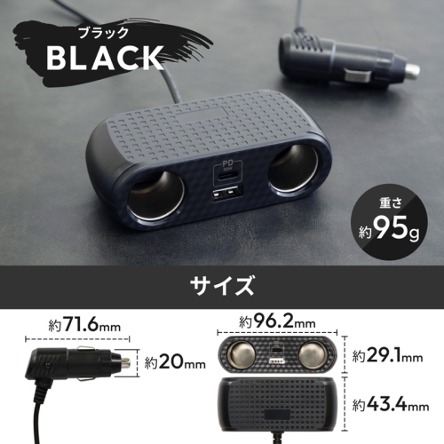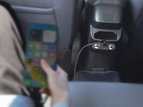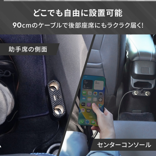 本製品は車のアクセサリーソケットに挿して使うケーブル型の車載充電器です。一体型のケーブルは長さが約90cmあり、後部座席に向けた設置も可能です。