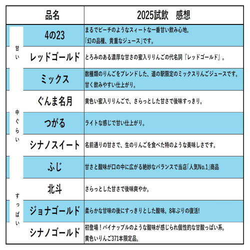 りんごジュースのラインナップは、つがるやふじ、ミックスなど全10種類!りんごの収穫量等によって製造できる量は様々ですので、事業者が品種をセレクトしてお送りします。