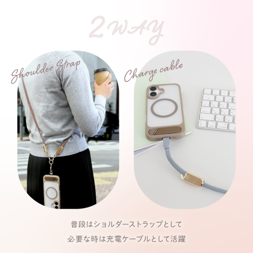 本製品はUSB Type-C to USB Type-Cケーブルとして使用可能な、スマートフォン用ショルダーストラップです。普段はショルダーストラップとして、必要なときは充電ケーブルとしてお使いいただけるユニークな2Way製品です。