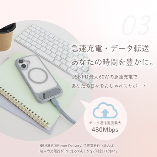 USB Power Delivery(PD)に対応しており、最大60W充電に対応。ハイパワーな充電器と併用すれば、充電時間の短縮が可能です。