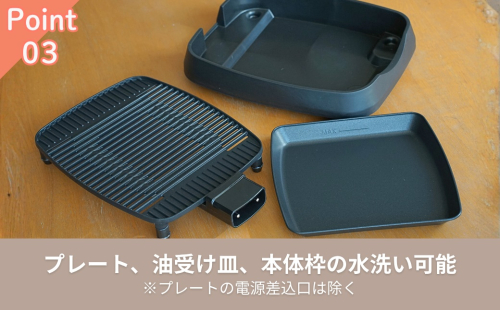 焼肉にぴったり!コンパクトグリルプレート 1~2人に最適な大きさで卓上で場所を取りにくい 保温~230℃の大火力まで温度調節機能付き 肉や魚の余分な脂が落ちるヘルシー調理 ヒータプレートが一体型でお手入れ簡単 プレート、油受け皿、本体枠の水洗い可能 ※プレートの電源差込口を除く コードの長さ約1.4m 消費電力650W