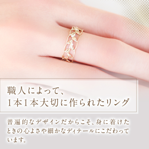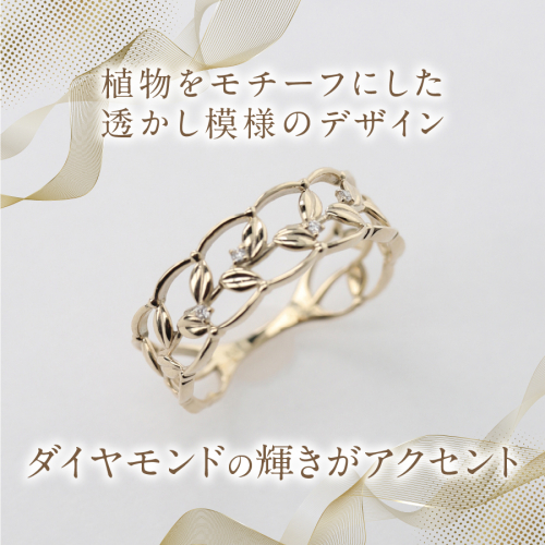 植物をモチーフにした透かし模様のデザインとダイヤモンドの輝きがアクセント。