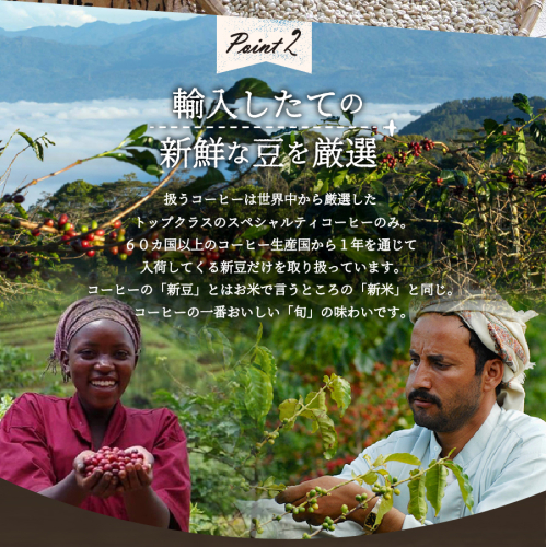 60カ国以上のコーヒー生産国から1年を通じて入荷してくる新豆だけを取り扱っています。